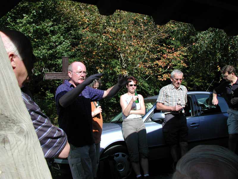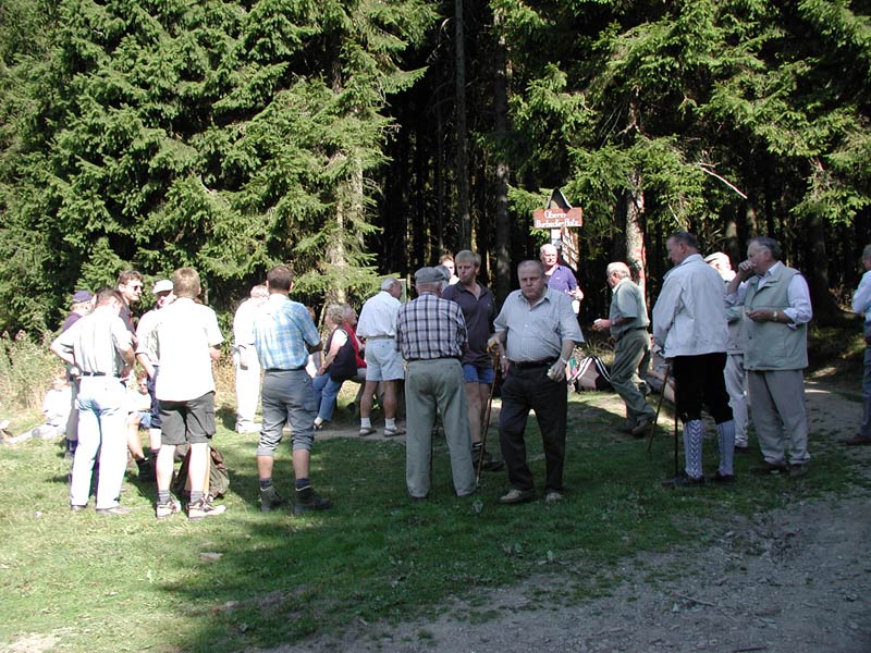 Mit Kind und Kegel versammelte man sich morgens nach der Messe vor der Kirche. Im Steinbruch wurde dann die erste Rast eingelegt. Kühles Bier wurde zum Frühstück gereicht. Die nächsten Wanderer stießen auf der Hochheide zum Trupp. Auch hier wurde gemütlich beieinander gesessen und auch gesungen.